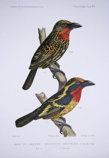 Keywords: F de Castelnau-oiseauxPl8.jpg Micropogon amazoninus Capito auratus<br/> Young male top <br/> Adult male bottom <br/> Gilded Barbet Compte rendu de l'expédition de Francis de Castelnau en Amérique du sud exemplaire de la bibliothèque patrimoniale de Gray France Scanned by Jeffdelonge Creator Francis de Laporte de Castelnau PD-old-100 Birds of South America Francis de Castelnau's expedition Capito auratus |