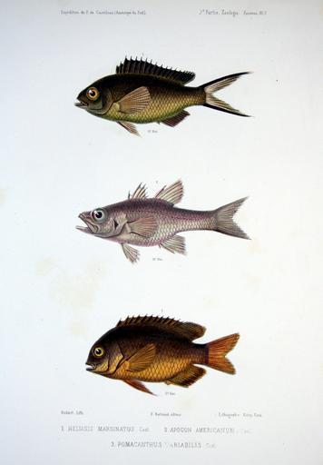Keywords: F de Castelnau-poissonsPl03.jpg From top to bottom <br/> Heliasis marginatus Chromis multilineata<br/> Apogon americanum Apogon americanus<br/> Pomacanthus variabilis Pomacentrus variabilis Syn Stegastes variabilis<br/> fr Expédition dans les parties centrales de l'Amérique du Sud de Rio de Janeiro à Lima et de Lima au Para sous la direction du Comte Francis de Castelnau 1856 exemplaire de la bibliothèque patrimoniale de Gray France Scanned by Jeffdelonge 1856 Creator Francis de Laporte de Castelnau PD-old-100 Francis de Castelnau's expedition Chromis multilineata Apogon americanus Stegastes variabilis Perciformes Fish of South America |