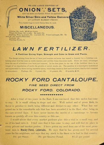 | Keywords: F. W. Bolgiano, seedsmen have won confidence for ten years (16347762396).jpg WE ARE LARGE GROWERS OF <br> ONION/SETS <br> And can make you Special Prices on application <br> White Silver Skin and Yellow Danvers <br> AT LOWEST MARKET PRICES <br> Two-bushel bags to bold Onion Sets 5c each <br> MISCELLANEOUS <br> Dibbles 30c each ; 3 00 per dozen <br> Whale Oil Soap 10c a cake By mail loc <br> Grafting Wax ” J pound 10c i pound 15c Pound packages 30c By <br> mail 8c per pound additio'nal <br> Trowels 10c <br> Weeding Hooks 5c <br> LAWN FERTILIZER <br> A Fertilizer Giving Vigor Strength and Color to Grass and Plants <br> The danger arising from the use of barn-yard manure on lawns has caused a demand for a fertilizer con- <br> taining plant food the same as stable manure and yet free from obnc»xious seeds There are irianj advantages <br> from the use of a fertilizer over barn-yard manure In the lirst place in the use of the fertilizer there is no <br> danger of an importation of seeds the growth of sorrel Aveeds etc The question is so thoroughly understood <br> and appreciated by those having beautiful lawns which they desire to feed and not injure that further comment <br> is unnecessary Package 10c 5 pound 25c 10 pounds 45c 25 pounds 1 00 <br> ROOKY FORD OANTALOUPE <br> FINE SEED DIRECT FROM <br> ROCKY FORD COLORADO <br> After a trial of two years in the East I am convinced that this melon has come <br> to stay It is small oblong in shape and size AVell netted and of green flesh its <br> flavor is pecidiar to itself being diflerent and distinct to any other What has sur- <br> prised me is the remarkable sale that has been accorded it in the East after i eing on <br> the cars several days I have never known the merits of a cantaloupe to become <br> known as quickly all over this country as this one <br> I would advise that every market gardener give this a trial in a small way and <br> see if his land suits it I feel sure that it has come to sta - and will And its place in <br> every private and market garden 1 have gotten my seed from one of the most prom- <br> inent men in RoCky Ford ColoradO He says that he has grown seed for several <br> years for his neighbors and says that my stock is the finest to be had in that country <br> Idc per Ounce oOc per Quarter Pound 1 2o per pound 42158399 132780 65933 Page 41 Text http //www biodiversitylibrary org/page/42158399 1899 10 5962/bhl title 65933 F W Bolgiano Co ; Henry G Gilbert Nursery and Seed Trade Catalog Collection Biodiversity Heritage Library F W Bolgiano seedsmen have won confidence for ten years Garden Stories Bulbs Plants Catalogs Fruit Garden tools Nurseries Horticulture Seeds Vegetables U S Department of Agriculture National Agricultural Library bhl page 42158399 dc identifier http //biodiversitylibrary org/page/42158399 bhlGardenStories BHLinbloom bulbs plants nurseries horticulture u s department of agriculture national agricultural library bhlgardenstories bhlinbloom Information field Flickr posted date ISOdate 2015-01-26 Check categories 2015 August 24 CC-BY-2 0 BioDivLibrary https //flickr com/photos/61021753 N02/16347762396 2015-08-24 07 50 37 cc-by-2 0 PD-old-70-1923 F W Bolgiano seedsmen have won confidence for ten years Photos uploaded from Flickr by Fæ using a script |