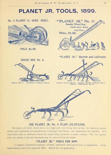 | Keywords: F. W. Bolgiano, seedsmen have won confidence for ten years (16187497359).jpg 1 85 B Sthket N \\\ Washington I C <br> 35 <br> PLANET JR TOOLS 1899 <br> No 2 PLANET Jr SEED DRILL <br> PLANET JR No 11 <br> Double Wheel Hoe <br> Cultivator Rake / <br> and Plow <br> Price 8 00 <br> PRICE 6 50 <br> HORSE HOE No 5 <br> PKICK Si6 T 5 WITHOUT AVHKKL 6 00 <br> PLANET JR Harrow and Cultivator <br> ¢KI K PLAIN 4 90 PRICE AVITH AVHKEL §16 15 <br> PKICK COMPLETE 87 50 <br> THE PLANET JR No 4 PLAIN CULTIVATOR <br> Our plain cultivator shown above is a light and very strong tool having our improved patent <br> hollow steel standards and paralled and extra high steel frame side adjustment for handles It is <br> used either with or without a wheel the wheel being preferred in most sections For very narrow <br> rows the outside teeth and standards may be removed from the frame <br> PLANET JR TOOLS FOR 1899 <br> A complete illustrated catalogue of these admirable labor-savers sent on application Great <br> improvements have been made for 1899 \railed free on application 42158393 132780 65933 Page 35 Text http //www biodiversitylibrary org/page/42158393 1899 10 5962/bhl title 65933 F W Bolgiano Co ; Henry G Gilbert Nursery and Seed Trade Catalog Collection Biodiversity Heritage Library F W Bolgiano seedsmen have won confidence for ten years Garden Stories Bulbs Plants Catalogs Fruit Garden tools Nurseries Horticulture Seeds Vegetables U S Department of Agriculture National Agricultural Library bhl page 42158393 dc identifier http //biodiversitylibrary org/page/42158393 bhlGardenStories BHLinbloom bulbs plants nurseries horticulture u s department of agriculture national agricultural library bhlgardenstories bhlinbloom Information field Flickr posted date ISOdate 2015-01-26 Check categories 2015 August 24 CC-BY-2 0 BioDivLibrary https //flickr com/photos/61021753 N02/16187497359 2015-08-24 07 52 10 cc-by-2 0 PD-old-70-1923 F W Bolgiano seedsmen have won confidence for ten years Photos uploaded from Flickr by Fæ using a script |