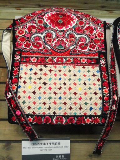 Keywords: Fabric - Yunnan Nationalities Museum - DSC04141.JPG Bai embroidered baby-carrying quilt Fabric exhibited in the Yunnan Nationalities Museum Kunming Yunnan China I took this photograph 2011-08-13 01 51 28 Daderot Public domain Fabric in the Yunnan Nationalities Museum Bai clothing |