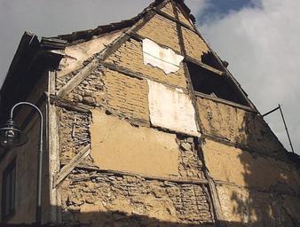 Keywords: Fachwerk-Konstruktion-2004.jpg Fachwerkhaus mit freigelegter Konstruktion mit Gefachen mit Holzgeflecht und Lehmbewurf und Gefachen aus Lehmziegeln in de Bad Langensalza Half-timbered house with exposed timber construction with infill of both wattle and daub and mud brick in Bad Langensalza Germany own 2004-09-30 de Benutzer Sebastian Wallroth Public Domain Sebastian Wallroth Timber framing in Bad Langensalza Half-timbered gables in Thuringia Cob building material Mud walls |