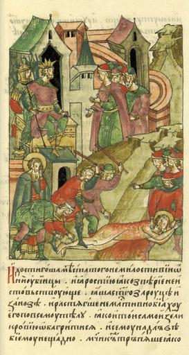 | Keywords: Facial Chronicle - b.06, p.157 - Death of Michael of Chernigov.jpg И п ишли к месту этому беспощадные те убийцы я остные как зве и и неистовые; взяли святого за уки и за ноги и астянув беспощадно били его по всему телу так что и сама земля там от к ови стала к асной И его долго избивали без милости мученик же те пел как будто http //www akteon-elib ru/LITsIeVOI-LIeTOPISNYI-SVOD-Russkaya-letopisnaya-istoriya-Kniga-6/ 38 century 16 anonymous PD-Old Files uploaded by Shakko from various sources Mikhail of Chernigov in miniature Facial Chronicle v 5 - Laptevskiy tom 1116-1252 1246 in Russia Death in medieval miniatures Russia |