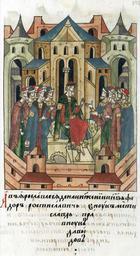 Keywords: Facial Chronicle - b.07, p.039 - Fedor Konstantinovich of Yaroslavl enthroned.jpg ЛИЦЕВОЙ ЛЕТОПИС ЫЙ СВОД А в Я ославле сел на княжение князь Федо Ростиславич внук стиславов п авнук Давыдов http //www akteon-elib ru/LITsIeVOI-LIeTOPISNYI-SVOD-Russkaya-letopisnaya-istoriya-Kniga-7/ 2 century 16 anonymous PD-Old Facial Chronicle v 6 - Ostermanovskiy 1-y tom 1254-1378 Files uploaded by Shakko from various sources 1294 in Russia |