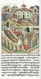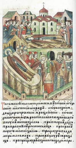 Keywords: Facial Chronicle - b.07, p.062 - Death of Fedor the Black.jpg ЛИЦЕВОЙ ЛЕТОПИС ЫЙ СВОД В том же году пост игся в святой ангельский иноческий об аз князь великий Феодо Че ный Я ославский сын великого князя Ростислава Смоленского внук стиславов п авнук Давыдов п ап авнук Ростиславов п еп авнук стиславов потомок п ащу а Владими а анамаха п ап ащу а Я ослава п еп ащу а великого Владими а и п еставился в святом ангельском и иноческом об азе и в схиме и положен был в це кви святого Спаса в Я ославле От него же тогда многие чудеса были и ныне многие све шаются чудеса и исцеление бесчисленное всем п иходяшим с ве ою http //www akteon-elib ru/LITsIeVOI-LIeTOPISNYI-SVOD-Russkaya-letopisnaya-istoriya-Kniga-7/ 2 century 16 anonymous PD-Old Facial Chronicle v 6 - Ostermanovskiy 1-y tom 1254-1378 Death in medieval miniatures Russia Files uploaded by Shakko from various sources 1299 in Russia Theodore Rostislavich the Black