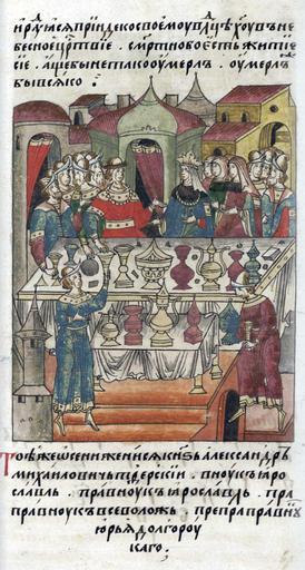 | Keywords: Facial Chronicle - b.07, p.215 - Weddings of Alexandr Mikhailovich of Tver.jpg ЛИЦЕВОЙ ЛЕТОПИС ЫЙ СВОД Также после сего князь Кавгадый и князь великий Ю ий Данилович осковский п ишли к телу его; и вот тело его нагое пове женным лежало И сказал князь Кавгадый с я остью князю Ю ию Даниловичу осковскому «Что это такое почему забылся ты е б ат ли тебе он ста ший как отец Да почему так тело его пове женное и нагое лежит на по угание всем Возьми же его и вези в свою землю и пог еби его в отчине его по вашему обычаю кото ый у вас есть» http //www akteon-elib ru/LITsIeVOI-LIeTOPISNYI-SVOD-Russkaya-letopisnaya-istoriya-Kniga-7/ 2 century 16 anonymous PD-Old Facial Chronicle v 6 - Ostermanovskiy 1-y tom 1254-1378 Files uploaded by Shakko from various sources Alexander Mikhailovich Weddings in medieval manuscripts Russia Anastasia of Halych |