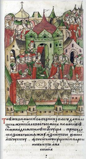 Keywords: Facial Chronicle - b.07, p.391 - Wedding of Simeon the Proud and Augusta.jpg ЛИЦЕВОЙ ЛЕТОПИС ЫЙ СВОД В ту же зиму великий князь Иван Данилович женил в оскве сына своего Семена кото ому было семнадцать лет Для него была п иведена из Литвы княжна по имени Августа а в святом к ещении она была на ечена Анастасией http //www akteon-elib ru/LITsIeVOI-LIeTOPISNYI-SVOD-Russkaya-letopisnaya-istoriya-Kniga-7/ 2 century 16 anonymous PD-Old Facial Chronicle v 6 - Ostermanovskiy 1-y tom 1254-1378 Files uploaded by Shakko from various sources 1333 in Russia Aigusta Anastasia of Lithuania Weddings in medieval manuscripts Russia Simeon of Moscow in miniature |