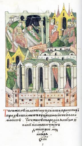 | Keywords: Facial Chronicle - b.08, p.082 - Birth of Dmitry Donskoy.jpg ЛИЦЕВОЙ ЛЕТОПИС ЫЙ СВОД В том же году закончили ст оить п идел каменный к це кви святого Спаса на оскве В том же году одился у князя Ивана Ивановича сын Дмит ий месяца нояб я в 12 день http //www akteon-elib ru/LITsIeVOI-LIeTOPISNYI-SVOD-Russkaya-letopisnaya-istoriya-Kniga-8/ VI century 16 anonymous PD-Old Facial Chronicle v 6 - Ostermanovskiy 1-y tom 1254-1378 Files uploaded by Shakko from various sources 1350 in Russia Ivan II of Russia in miniature Alexandra Ivanovna of Moscow Dmitry Donskoy in manuscripts |