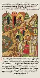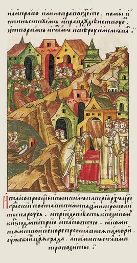 Keywords: Facial Chronicle - b.09, p.275 - Patriarch Nilus and Pimen.jpg ЛИЦЕВОЙ ЛЕТОПИС ЫЙ СВОД И тогда п еосвященный ил пат иа х Ца ьг адский поставил Пимена в мит ополиты всея Руси Дошла об этом весть к великому князю Дмит ию Ивановичу что « итяй твой вско е п еставился вблизи Ца ьг ада а мит ополитом стал Пимен» http //sterligoff ru/ century 16 anonymous PD-Old Facial Chronicle v 6 - Ostermanovskiy 1-y tom 1254-1378 Files uploaded by Shakko from various sources 1379 in Russia Pimen Metropolitan of Moscow Mityay