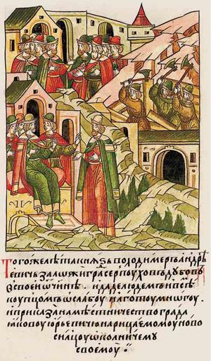 Keywords: Facial Chronicle - b.09, p.024 - Foundation of Serpukhov.png ru Лицевой летописный свод 9 том ст аница 24 Того же лета 6882 князь Володиме ъ Анд еевичь заложи г адъ Се пуховъ дубовъ в своей Отчине и даде людемъ всемъ купцомъ ослабу лготу многу и п иказа наместничество г ада Якову Ю ьевичю на ица ему овосильцу окольничему своему 16th century http //www sterligoff ru/books/Rus_Kniga 209 pdf anonymous other versions PD-Art Uploaded with UploadWizard Serpukhov Facial Chronicle v 6 - Ostermanovskiy 1-y tom 1254-1378 Vladimir Andreevich the Bold in miniature |