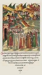 Keywords: Facial Chronicle - b.10, p.102.jpg ЛИЦЕВОЙ ЛЕТОПИС ЫЙ СВОД О Пимене Тогда Пимен мит ополит освободился от заточения и от уз ибо в это в емя послал за ним в Тве ь князь великий Дмит ий Иванович со многою честью зовя его к себе в оскву на мит ополию Он же п ишел из заточения на оскву и вст етил его священный собо с к естами а сам князь великий вст етил его далеко за го одом с детьми своими и с боя ами и со множеством на ода с честью и с любовью И был мит ополит Пимен на оскве и на подлежащих ему го одах владея по обычаю це ковными делами и все слушались и чествовали его http //www akteon-elib ru/LITsIeVOI-LIeTOPISNYI-SVOD-Russkaya-letopisnaya-istoriya-Kniga-10/ 14 century 16 anonymous PD-Old Facial Chronicle v 7 - Ostermanovskiy 2-y tom 1378-1424 Files uploaded by Shakko from various sources 1383 in Russia Pimen Metropolitan of Moscow Dmitry Donskoy in manuscripts
