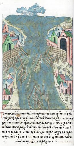 Keywords: Facial Chronicle - b.10, p.196.jpg ЛИЦЕВОЙ ЛЕТОПИС ЫЙ СВОД Той же осенью были мо озы великие и еки и озе а заме зли и снег выпал; также в полночь месяца октяб я в 26-й день в овго оде Великом поднялся вете великий и понес лед из озе а в еку Волхов и вынес из Великого моста 9 устоев http //www akteon-elib ru/LITsIeVOI-LIeTOPISNYI-SVOD-Russkaya-letopisnaya-istoriya-Kniga-10/ 14 century 16 anonymous PD-Old Facial Chronicle v 7 - Ostermanovskiy 2-y tom 1378-1424 Files uploaded by Shakko from various sources 1387 in Russia Volkhov River in art