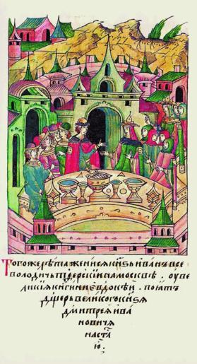 | Keywords: Facial Chronicle - b.11, p.359 - Wedding of Ivan Vsevolodovich and Anastasia of Moscow.gif В том же году женился князь Иван Всево- лодович Тве ской в оскве у великой княгини Евдокии взяв дочь великого князя Дмит ия Ивановича астасью http //www runivers ru/bookreader/book480116/ page/242/mode/1up century 16 anonymous PD-Old Files uploaded by Shakko from various sources Facial Chronicle v 7 - Ostermanovskiy 2-y tom 1378-1424 Weddings in medieval manuscripts Russia 1397 in Russia Princes of Tver Princesses of Moscow daughters Eudoxia of Moscow in miniature |