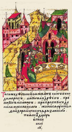 | Keywords: Facial Chronicle - b.11, p.510 - Wedding of Ivan Vladimirovich of Serpukhov.gif В том же году князь Иван сын Владими ов внук Анд еев п авнук Иванов п ап авнук Даниила осковского женился на доче и кня- зя Феодо а Олеговича Рязанского Василисе http //www runivers ru/bookreader/book480116/ page/242/mode/1up century 16 anonymous PD-Old Files uploaded by Shakko from various sources Facial Chronicle v 7 - Ostermanovskiy 2-y tom 1378-1424 Weddings in medieval manuscripts Russia Ivan Vladimirovich of Serpukhov Princes of Ryazan |