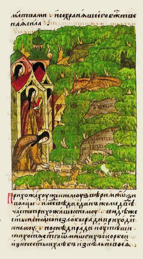 | Keywords: Facial Chronicle - b.11, p.036 - Sergius of Radonezh.gif П иходили к нему многие зве и волки и медведи И один медведь очень ча- сто п иходил к нему И понял святой что не в злобе он п иходит а из-за еды и желая утешить святого в его ско бях Вынес святой из кельи своей хлеб и положил на колоду и на пни П ишел медведь тихий и к от- кий и весело и а- достно стал смот еть на святого Святой возблагода ил Бога поняв что этот лю- тый зве ь медведь был от Бога послан утешением ему как овца водво ившая- ся с ним в пустыне И ко мил его каждый день оставляя хлеб на колоде или на пне и медведь это съе- дал И когда совсем мало хлеба оставалось у святого он мед- ведя ко мил а сам оставался голодным Он готов был себя оставить голодным чем медведя сожителя своего пустынного оставить голодным Очень любил святой молчание потому и де знул поселиться в пустынном месте и жил там один в без- молвии потому что вкусив божественной сладости безмолвия уже не мог отступить и оставить выб анный путь http //www runivers ru/bookreader/book480190/ page/7/mode/1up century 16 anonymous PD-Old Files uploaded by Shakko from various sources Facial Chronicle v 7 - Ostermanovskiy 2-y tom 1378-1424 Sergius of Radonezh in manuscripts |