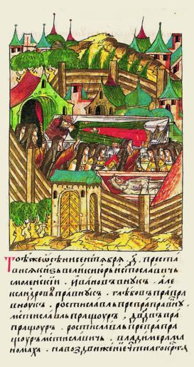 Keywords: Facial Chronicle - b.12, p.147 - Death of Yuri Svyatoslavovich of Smolensk.gif В ту же осень месяца сентя- б я в 4 день п еставился великий князь Ю ий Святосла- вич Смоленский внук Иванов п авнук Алек- санд ов п ап авнук Глебов п еп ап авнук Ростислава п ащу а стислава п ап а- щу а Давида п еп а- п ащу а Ростислава стислава Владими а аномаха на Воз- движение Честного К еста не в своем великим княжестве Смолен- ском а скитаясь в чу- жой ст ане ст анствуя в изгнании пе еходя с места на место в пустынях своего великого княжения Смоленского лишен- ный отчины и дедины своей великой княги- ни детей и б атьев одственников своих князей и боя воевод и слуг И п ебывал князь в Рязанской земле в пустыне у одного х истолюби- вого ста ца игумена Пет а там п овел несколько дней в пе- чали и ско би сетуя и плача вспоминая свои беды и неп ият- ности и п ипомнив все это в своем уме стал плакать и сето- вать о своих г ехах желая отказаться от суетной ми ской жиз- ни забыть славу ми а сего и угодить п а- ведной жизнью Богу Там князь заболел и немного п оболев скончался о Господе п оводили его тело с честью похо они- ли с надг обными песнопениями И так п е вался од великих князей Смоленских и великое княжество Смоленское поте яло своих великих князей и стал п авить в Смо- ленске великий князь Литовский Витовт Кейстутович а после него и д угие вели- кие князья Литовские назначали туда своих наместников http //www runivers ru/bookreader/book480190/ page/7/mode/1up century 16 anonymous PD-Old Files uploaded by Shakko from various sources Facial Chronicle v 7 - Ostermanovskiy 2-y tom 1378-1424 Death in medieval miniatures Russia 1407 in Russia Yuri Svyatoslavovich of Smolensk |