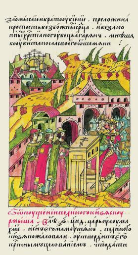 | Keywords: Facial Chronicle - b.14, p. 083 - Vasily II swearing.gif Об освобождении великого князя из Ку мыша В 6954 году ца ь Улу- ахмет и его сын амутяк пожало- вали великого князя заставили его п ине- сти клятву на к есте что даст 84 и отпустили его из Ку мыша на Пок ов П есвятой Бого о- дицы месяца октя- б я в 1 день а с ним князя ихаила и всех остальных сколько их с ними было И отп а- вили с ними своих по- слов многих князей со многими людьми князя Сеит-Асана и Утеша и Ку аиша и Дылхозю и Ада а и многих д угих за себя выкуп сколько может http //www runivers ru/bookreader/book480451/ page/25/mode/1up century 16 anonymous PD-Old Facial Chronicle v 4 - Golytsinskiy tom 1114-1247; 1425-1472 Files uploaded by Shakko from various sources 1445 in Russia Vasily II of Moscow in miniature |