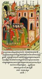 | Keywords: Facial Chronicle - b.17, p. 386 - Dmitriy the Grandson's coronation.gif  пошел великий князь Иван к себе а великий князь Дмит ий в шап- ке и в ба мах только как из две ей це кви П ечистой вышел его тут же т ижды осыпал золотыми и се еб я- ными деньгами сын великого князя князь Ю ий а дети велико- го князя шли  ядом с ним и все боя е; http //sterligoff ru/books/Rus_Kniga 2018 pdf 16th-century anonymous PD-Old Facial Chronicle v 8 - Shumilovskiy tom 1425; 1478-1533 Files uploaded by Shakko from various sources 1498 in Russia Dmitriy Ivanovich the Grandson in miniature Coronations in Russia Yuriy Ivanovich of Dmitrov |