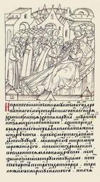 Keywords: Facial Chronicle - b.19, p. 318 - Vasily III giving farewell to son Ivan IV.gif И п инес к ве- ликому князю Богом да о- ванного ему ста шего сына его ца я и вели- кого князя Ивана на уках шу ин его князь ихаил Глинский а за ним п ишла боя ыня его Аг офена жена Василия Анд еевича; еще он тогда очень малым ебенком был только т ех лет и т ех месяцев от ождения И великий госуда ь Василий склонился не- много на од е своем и слезы из очей как ст ую испуская снял с себя к ест Пет а чу- дотво ца и п иложил к к есту сына своего; и начал http //www runivers ru/bookreader/book481461/ page/31/mode/1up 16th-century anonymous PD-Old Facial Chronicle v 10 - Tsarstvennaya kniga 1533-1553 Death in medieval miniatures Russia Files uploaded by Shakko from various sources Vasily III of Russia in miniature 1533 in Russia Ivan IV of Russia in manuscripts House of Obolensky
