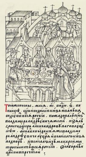 | Keywords: Facial Chronicle - b.20, p. 397 - Vladimir of Staritsa's wedding.gif В ту же весну ме- сяца мая в 18 день в шестое воск есенье после Пасхи ца ь и великий князь Иван Василье- вич всея Руси пожало- вал князя Владими а Анд еевича женил его взял за него дочь Александ а агого Ев- докию; а свадьба князя Владими а Анд ееви- ча п оходила на дво е у ца я и великого князя и венчал их ака ий мит ополит всея Руси в собо ной це кви Успения П е- святой Бого одицы http //www runivers ru/bookreader/book482205/ page/17/mode/1up century 16 anonimus Facial Chronicle v 10 - Tsarstvennaya kniga 1533-1553 Files uploaded by Shakko from various sources 1551 in Russia PD-Art Vladimir Andreevich of Staritsa in miniature Weddings in medieval manuscripts Russia House of Nagoy |