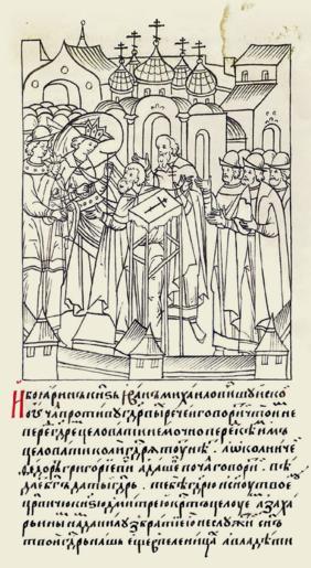 Keywords: Facial Chronicle - b.21, p. 545.gif иниатю а Лицевого летописного свода XVI в И боя ин Иван ихайлович Шуйский начал п отив госуда евых ечей гово ить что им не пе ед госуда- ем целовать нельзя пе ед кем им цело- вать если госуда я нет А окольничий Федо Г иго ьевич Адашев начал гово- ить «Знай Бог да и ты госуда ь тебе госуда ю и сыну твоему ца евичу Дми- т ию к ест целуем а Заха ьиным Данилу с б атьями не хотим служить Сын твой госуда ь наш еще в пеленах и владеть 546 И был мятеж великий и шум и ечи многие во всех боя ах что не хотят пеленочнику служить нами будут Заха ьины Данила с б атьями А мы уже от боя в твоем младенчестве беды видели многие» http //www runivers ru/bookreader/book482205/ page/43/mode/1up century 16 anonimus Facial Chronicle v 10 - Tsarstvennaya kniga 1533-1553 PD-Art 1552 in Russia Dmitriy Ivanovich 1552-1553