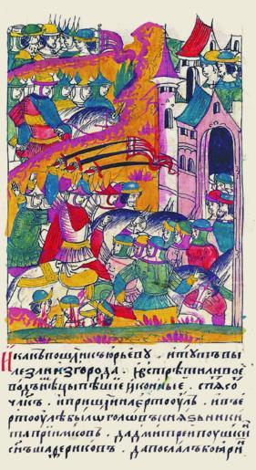 Keywords: Facial Chronicle - b.22, p. 462.gif И как подошли к Ю ьеву то тут вышли из го ода и вст етили воевод пешие и конные немцы около 500 человек и выступили п отив пе едового от яда; а в нем были головы князь икита П иимков и Дмит ий Пушкин сын Шафе иков и послал боя ин и воевода Иван Васильевич Ше еметев голову Василия Вешнякова а с ним боя ских детей И послали воеводы князь Василий Семенович Се еб яный и Иван еньшой Ше еметев из п авой уки боя ских детей и из пе едового полка и из п авой уки многих че касов и боя ские дети подошли и азбили немцев наголову и били их до самого го ода http //www runivers ru/bookreader/book482205/ page/17/mode/1up century 16 anonimus Facial Chronicle v 9 - Sinodalniy tom 1533-1542; 1553-1567 Files uploaded by Shakko from various sources PD-Art House of Pushkin |