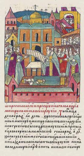Keywords: Facial Chronicle - b.23, p. 297 - Death of Macarius.jpg Лицевой летописный свод О п еставлении п е- освященного ака- ия мит ополита всея Руси В том же месяце декаб е в 31 день скончался п еосвя- щенный ака ий мит ополит всея Руси и пог ебен был в собо ной це кви Успения п есвятой Бого одицы в оскве в янва е в 1 день а пог ебении же его был ца ь и великий князь всея Руси Иван Васильевич и князь Владими Анд еевич и князья и боя е http //www runivers ru/bookreader/book482205/ page/17/mode/1up century 16 anonimus Facial Chronicle v 9 - Sinodalniy tom 1533-1542; 1553-1567 Death in medieval miniatures Russia Files uploaded by Shakko from various sources PD-Art 1563 in Russia Macarius of Moscow Vladimir Andreevich of Staritsa in miniature