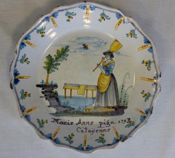 Keywords: Faience Citoyenne 1793.jpg en The manufacturer of faience in Nevers adapted very quickly to the French Revolution Instead of saints they showed working people The name Marie-Anne was very common at that time especially on the country side and amoung women that worked in the households of richer people/ nobility It became also the first name of the symbol of the French Revolution and later the Republic Marianne This dish shows Marie-Anne Pigu a symbol for the common women of Nevers 1793 as a laundress own Stanzilla Anonymous 1793 Faience of Nevers on the French Revolution Plates of the French Revolution 1793 works in France Laundry in art Files by User Stanzilla Faience in the Musée des Beaux-Arts de Bernay Cc-zero |