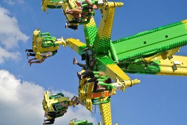 Keywords: fair ride folk festival entertainment year market carnies fairground pleasure green yellow colorful movement action attraction speed thrill carousel hustle and bustle fun