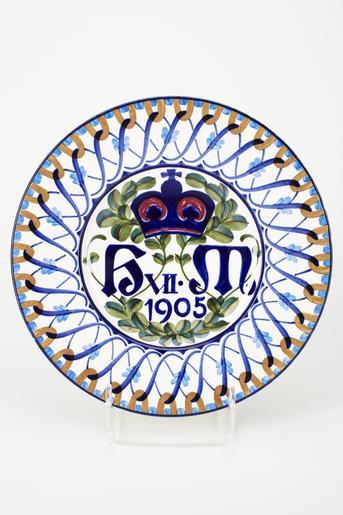 | Keywords: Fajans, tallrik, baksida, 1905-1906 - Hallwylska museet - 90472.tif TALLRIK Rund med kälformig kep och snett utstående brett brätte samt på fotkant Dekor I färger under blyglasyr denna finsprucken Godset vitt På bottnens insida konung Haakon VII s och drottning Mauds av Norge krönta initialer i mörkblått kronans foder i mörkrött nedtill årtalet i samma färg som initialerna; nedanför årtalet samt kring initialerna rankor i mörkare och ljusare grönt med blad liknande lingonrisets nerverna röda; runt bottenkanten en mörkblå rand På brättet dekor av tre löst tvinnade band i mörkblått upphängda vid ytterkanten i bruna öglor på varannan av bandet vindlingar två par bladliknande ornament i ljusblått Runt ytterkanten en rand i mörkblått därinnanför en något bredare dylik i ljusblått avbruten av nyssnämnda öglor På bottnens utsida en påklistrad lapp i grönt med upphöjt guldtryck med texten KRISTIANIA KUNSTHANDEL H 3 3 cm; D 24 8 cm Köbenhavns fajancefabrik f d Aluminia Från slutet av 1905 eller från 1906 Gåva till Wilhelmina von Hallwyl från hennes dotterson Rolf de Maré julaftonen 1914 Inköpt av honom hos konsthandlaren Ludv F Olsen Co Kristiania original caption Fajans tallrik baksida 1905-1906<br/> Nyckelord Fat Tallrik Signatur Fajans Föremålsbild - 1905 1906 size cm 3 3 24 8 HWY place of origin Köpenhamn DK original filename hm_dig7214 13462 inventory number HWY XLVI I A b 01 90472 CC-BY-SA Erik Lernestål <gallery caption Different images of same object > File Fajans tallrik baksida 1905-1906 - Hallwylska museet - 90471 tif </gallery> Erik Lernestål Plates Plates Signatures Faience Faience in the Hallwyl museum Media contributed by LSH 2013-10 |