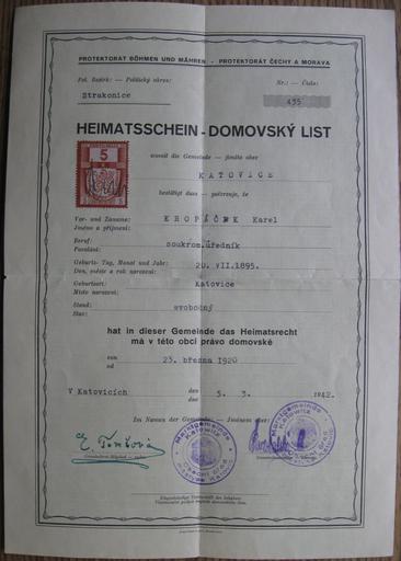 Keywords: Falesny.Domovsky.List.Karel.Prokop.Alias.Karel.Kropacek.jpg cs Karel Prokop 1893 - 1943 - za první světové války příslušník československých legií v Rusku; za protektorátu přednosta a inspektor Finančního úřadu potravní daně a zároveň vedoucí odbojové skupiny v Praze Jinonicích jakož i zástupce velitele ilegální skupiny Vašek-Čeněk Po zátahu gestapa na jinonický akcíz 4 října 1941 přešel do ilegality a ukrýval se na plzeňsku kde používal falešné doklady na jméno Karel Kropáček Zatčen gestapem 4 července 1942 v Plzni - Skvrňanech Popraven dne 8 září 1943 ve věznici v Berlíně-Plötzensee Falešný domovský list z roku 1941 en Karel Prokop 1893 - 1943 During the First World War he was a member of the Czechoslovak legions in Russia During the protectorate he was a chief inspector of the Tax Office and excise taxes and he was also leader of resistance group in Prague Jinonice and also he was a deputy commander of an illegal group Vašek-Čeněk After the gestapo made an attack on the Jinonice excise duty office 4 October 1941 he went underground and he hid himself in around Pilsen where he used false documents in the name of Karel Kropáček Arrested by the Gestapo July 4 1942 in Pilsen - Skvrňany Executed to death on September 8 1943 in the prison in Berlin-Plötzensee Fake home certificate 1941 1941-10-31 CZ Volně přístupné archivy České republiky <br/> EN Freely accessible archives of the Czech Republic CZ Autorem tohoto dokumentu je neznámá osoba <br/> EN Author of this document is unknown person other versions Custom license marker 2016 04 23 anonymous-EU/cs PD-old PD-CzechGov Heroes Protectorate of Bohemia and Moravia Karel Prokop |