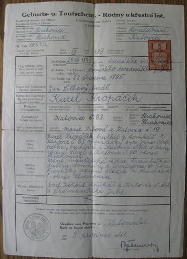 Keywords: Falesny.Rodny.List.Karel.Prokop.Alias.Karel.Kropacek.jpg cs Karel Prokop 1893 - 1943 - za první světové války příslušník československých legií v Rusku; za protektorátu přednosta a inspektor Finančního úřadu potravní daně a zároveň vedoucí odbojové skupiny v Praze Jinonicích jakož i zástupce velitele ilegální skupiny Vašek-Čeněk Po zátahu gestapa na jinonický akcíz 4 října 1941 přešel do ilegality a ukrýval se na plzeňsku kde používal falešné doklady na jméno Karel Kropáček Zatčen gestapem 4 července 1942 v Plzni - Skvrňanech Popraven dne 8 září 1943 ve věznici v Berlíně-Plötzensee Falešný rodný a křestní list vytvořen 1941 en Karel Prokop 1893 - 1943 During the First World War he was a member of the Czechoslovak legions in Russia During the protectorate he was a chief inspector of the Tax Office and excise taxes and he was also leader of resistance group in Prague Jinonice and also he was a deputy commander of an illegal group Vašek-Čeněk After the gestapo made an attack on the Jinonice excise duty office 4 October 1941 he went underground and he hid himself in around Pilsen where he used false documents in the name of Karel Kropáček Arrested by the Gestapo July 4 1942 in Pilsen - Skvrňany Executed to death on September 8 1943 in the prison in Berlin-Plötzensee Fake birth and baptismal certificate 1941 1941-10-31 CZ Volně přístupné archivy České republiky <br/> EN Freely accessible archives of the Czech Republic CZ Autorem tohoto dokumentu je neznámá osoba <br/> EN Author of this document is unknown person other versions Custom license marker 2016 04 23 anonymous-EU/cs PD-old PD-CzechGov Heroes Protectorate of Bohemia and Moravia Karel Prokop |