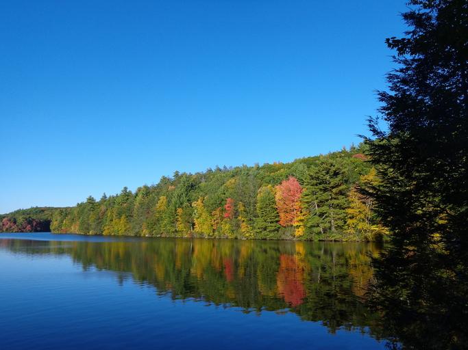 Keywords: fall autumn river nature yellow leaves trees foliage golden october colorful colors water fall leaves seasonal calm outdoor connecticut mashapaug cove