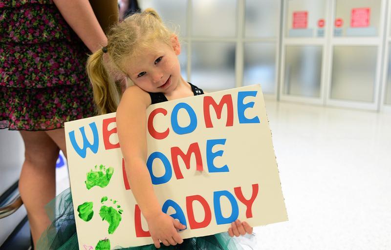 Keywords: family love father daughter military young girl hug waiting shy parent relationship arrival duty little childhood cute sign