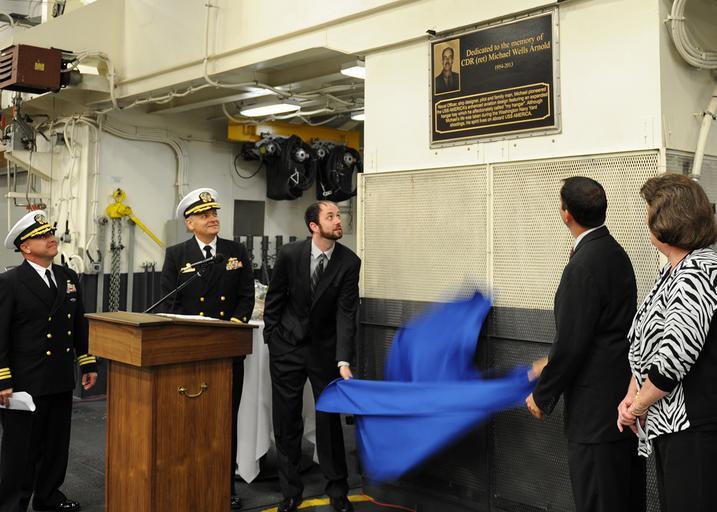 Keywords: Family members unveil plaque dedicated to retired Cmdr. Michael W. Arnold 141010-N-CC789-038.jpg en Family members of retired Cmdr Michael W Arnold unveil a plaque dedicated to his memory in the hangar deck of the future amphibious assault ship USS America LHA 6 Arnold a Navy veteran and avid pilot lost his life on Sept 16 2013 in the Washington Navy Yard shooting He pioneered America ™s enhanced aviation design featuring an expanded hangar bay which he called my hangar bay America is in San Francisco Bay for the Navy ™s 34th annual fleet week During the visit the crew is scheduled to participate in a variety of community relations projects throughout the Bay area America is scheduled to be commissioned Oct 11 U S Navy photo by Mass Communication Specialist 1st Class Vladimir Ramos/Released 2014-10-10 Canadian Forces PO 1 VLADIMIR RAMOS https //www dvidshub net/image/1614181 141010-N-CC789-038 2014-10-14 23 19 SAN FRANCISCO CA US PD-USGov-Military-Navy USS America LHA-6 Images from DoD uploaded by Fæ |