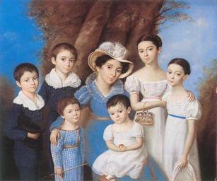 | Keywords: Family portraits of Novosiltsev.jpg ru По т ет Екате ины Ивановны овосильцевой с детьми 1830 Е И овосильцева 1864 ожденная г афиня Ап аксина жена иколая Пет овича овосильцева Род ее мужа не был д евним его основоположник Пет овосильцев из о ловских мещан начал службу канцеля истом дослужился до должности пете бу гского вице-губе нато а и получил потомственное дво янство Сошлемся еще аз на Вигеля ельзя было не полюбить г овосильцева за его едкий ум и необыкновенные да ования они к ивому подьячему отк ыли путь до степени госуда ственного человека и дали его семейству п итя же некото ое п аво на знатность Его сын иколай стал сенато ом и това ищем минист а внут енних дел и смог жениться на г афине Ап аксиной У них были дети А далион впоследствии полковник 1878 Василий Пет ; Иван а ия ф ейлина 1865 и Екате ина с 1838 года ставшая женой гофма шала Эммануила Дмит иевича а ышкина Изоб аженные Екате ина Ивановна овосильцева у г афиня Ап аксина 179 1864 жена иколая Пет овича овосильцева 1789-1856 с детьми А далион впоследствии полковник 1816 1878 Василий 1818-1870 Пет 1829-1864 ; Иван 1826-1870 а ия ф ейлина 1815 1865 и Екате ина 1817-1869 с 1838 года замужем за гофма шалом Эммануилом Дмит иевичем а ышкиным http //bibliotekar ru/rusKart/24 htm К Ба ду анее - еизвестный художник пе вой т ети 19 века 1830 House of Apraksin Carl Bardou House of Novosiltsev House of Naryshkin Family portraits of Russia 1830s portrait paintings Portraits of mothers with children Children in Russian portraits 1830s portraits of Russia female Females with blue dresses in art Portraits with natural background 1830s dresses PD-old |