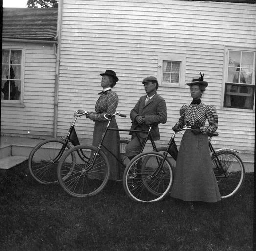 Keywords: blackandwhite monochrome bike vehicle black and white "Fannie, Lillie & Harry & their bicycles." Photo is undated. "Fannie, Lillie & Harry & their bicycles." Photo is undated.