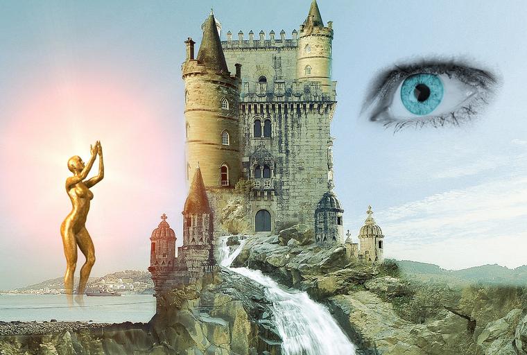 Keywords: fantasy surreal fairytale mysterious magic mystery adventure imagination eye castle gold golden female woman girl blue eyes photocomposition