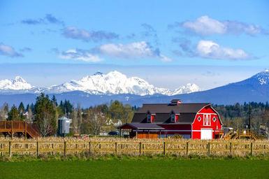 Keywords: farm agriculture landscape mountains livestock rural country farming pasture milking countryside animals field barns silos buildings fence clouds panorama