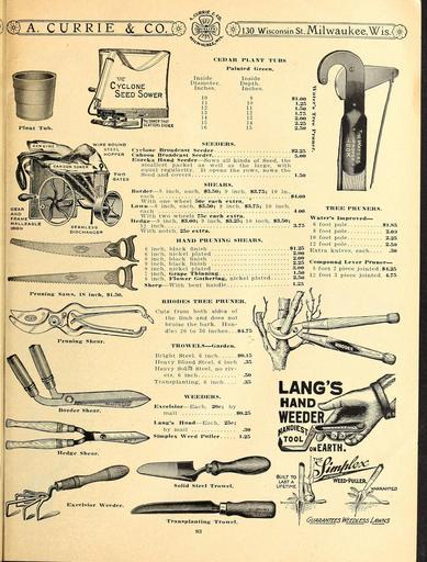 Keywords: Farm and garden annual (16793553912).jpg f i«£ L« <br> A CURRIE SlCOA <br> 130 Wisconsin St Mil waukee NX is <br> IRE BOUND <br> STEEL <br> HOPPER <br> CEDAR PLANT TUBS <br> Painted Green <br> The SOWER THAT <br> SCATTERS EVENLt <br> Inside <br> Diameter <br> Inches <br> 10 <br> 11 <br> 12 <br> 13 <br> 14 <br> 15 <br> 16 <br> Inside <br> Depth <br> Inches <br> 9 <br> 10 <br> 11 <br> 12 <br> 13 <br> 14 <br> 15 <br> SEEDERS <br> Cyclone Broadcast Seeder Mu <br> Calioou Broadcast Seeder 5 00 <br> EHreka Hand Seeder ” Sows all kinds of Seed the <br> smallest packet as well as the large with <br> equal regularity It opens the rows sows the <br> Seed and covers 1 50 <br> SHEARS <br> Border ” S inch each 3 ' 0; 9 inch 3 75; 10 in <br> each SM OO <br> With one wheel 50c each extra ' <br> Lawn ” 8 inch each 3 50; 9 inch 3 75; 10 inch <br> each 4 0O <br> With t'wo wlieels 75c each extra <br> Hedge ” S inch 3 O0; 9 inch 'i« 25; 10 inch 3 50; <br> 12 inch 3 75 <br> With notch 25c extra <br> inch <br> inch <br> inch <br> inch <br> inch <br> inch <br> inch <br> Sheep ” <br> HAND PRUNING SHEARS <br> black finish 1 25 <br> nickel plated 2 0O <br> black finish 2 00 <br> black finish 2 25 <br> nickel plated 3 0O <br> Grape Thinning- 1 50 <br> Flower Gathering nickel plated 2 50 <br> -With bent handle 1-25 <br> TREE PRUNBRS <br> Water' s Improved ” <br> 6 foot pole 1 85 <br> 8 foot pole 2 0t <br> 10 foot po le 2 25 <br> 12 foot pole 2 50 <br> Extra knives each 30 <br> Compound Lever Pniner ” <br> 8 foot 2 piece jointed 4 25 <br> 12 foot 3 piece jointed 4 75 <br> RHODES TREE PRUNER <br> Cuts from both sides of <br> tlie limb and does not <br> bruise the bark Han- <br> dles 20 to 36 inches 4 75 <br> TROWELS ” Garden <br> Bright Steel 6 inch 0 15 <br> Heavy Blued Steel 6 inch 35 <br> Heavy SoliTi Steel no riv- <br> ets 6 inch 50 <br> Transplanting 6 inch 35 <br> WEEDERS <br> Excelsior ” Each 20e; by <br> mail 0 25 <br> Lang's Hand ” Each 25c; <br> by mail 30 <br> Simplex Weed Puller 1 25 <br> LANG' <br> HAND <br> WEEDER <br> Solid Steel Trowel <br> Excelsior AVeeder <br> Transplanting Trowel <br> 93 <br> juamntfes IV££piess Lawns 42216676 133098 66159 Page 93 Text http //www biodiversitylibrary org/page/42216676 1918 10 5962/bhl title 66159 A Currie Company ; Henry G Gilbert Nursery and Seed Trade Catalog Collection Biodiversity Heritage Library Farm and garden annual 1922 Garden Stories Bulbs Plants Catalogs Equipment and supplies Gardening Nurseries Horticulture Seeds U S Department of Agriculture National Agricultural Library bhl page 42216676 dc identifier http //biodiversitylibrary org/page/42216676 bhlGardenStories A Currie Company Milwaukee Wis garden Tools and Implements BHLinbloom bulbs plants nurseries horticulture u s department of agriculture national agricultural library bhlgardenstories a currie company milwaukee wis garden tools and implements bhlinbloom Information field Flickr posted date ISOdate 2015-03-12 Check categories 2015 August 24 CC-BY-2 0 BioDivLibrary https //flickr com/photos/61021753 N02/16793553912 2015-08-24 20 57 18 cc-by-2 0 PD-old-70-1923 Farm and garden annual 1918 Photos uploaded from Flickr by Fæ using a script |