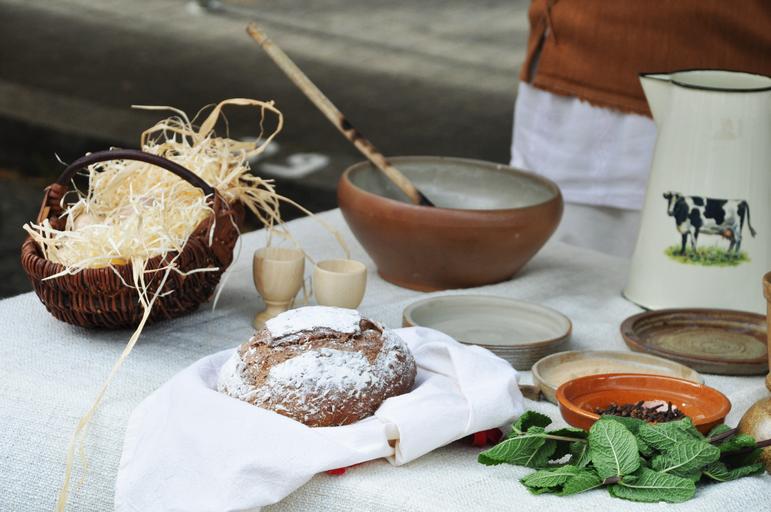 Keywords: farm kitchen dishes bread eat food recipe gastronomy bio french straw power tradition medieval festival gisors france eggs eggcup basket mint milk pot