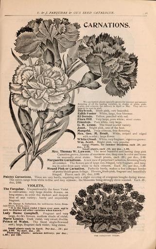 | Keywords: Farquhar's catalogue of seeds 1901 (16583182105).jpg A' J FARQUHAR c CO 'S SEED CATALOGUE <br> CARNATIONS <br> We can furnish plants specially grown for summer and autumn <br> flowering of all the leading varieties in shades of white pink <br> scarlet and crimson for delivery in April or May They are toe <br> large to be sent by mail <br> Daybreak Blush pink very beautiful <br> Edith Foster White large free bloomer <br> EI Dorado Yellow penciled with red <br> Flora HilL Very large pure white; stout stems <br> Freedom Pure white very large <br> Q H Crane The finest-scarlet variety <br> Joost Bright pink one of the best <br> Mangold Deep crimson free flowering <br> Mrs Geo M Bradt White striped and edged <br> with scarlet ; large flower <br> White Cloud White very fragrant ; vigorous grower <br> Wm Scott Bright pink very popular <br> Large Plants for summer blooming each 25; per <br> doz 2 50 <br> Small plants each 10; per doz 1 00 <br> Mrs Thomas W Lawson 'lhe most beautiful and lasting deep pink <br> Carnation grown ; blooms of enormous size deep rose In color and borne <br> on unusually stout stems Small plants each 20; per doz 2 00 <br> Marguerite Carnations A new race of perpetual Carnation blooming freely <br> all summer The flowers are of large size fringed very fragrant and rang- <br> ing in color from pure white to dark crimson Each 15; per doz 1 50 <br> Mound Pink or Carnation Perfectly hardy makes a fine compact border <br> of pretty bluish-green foliage Flowers blush-pink fragrant and beautifully <br> fringed Plants each 20; doz 2 00 <br> Paisley Carnations These are very hardy requiring only a slight covering of evergreen boughs during winter <br> The colors range from white to lilac and rosy crimson ; the blossoms being strongly clove scented Each 25 ; <br> doz 2 -50 <br> VIOLETS <br> The Farquhar Unquestionably the finest Violet <br> in cultivation ; very large double flowers on <br> long stems ; in color the darkest and deepest <br> blue of any variety; hardy and exquisitely <br> fragrant <br> Mr George A Sutherland the well-known florist Brom- <br> rield Street Boston says <br> ˘ – It is the finest violet I have ever seen and is <br> sure to displace all other varieties when known <br> Lady Hume Campbell Fragrant and very <br> large double flowers medium shade of violet <br> Marie Louise Dark violet very sweet double <br> Prince of Wales The finest single-flowered <br> sort ; large fragrant dark violet ; long stems <br> Small plants ready in April Per doz <br> 10O 3 00 By mail doz 60 <br> Flowering plants; autumn delivery <br> 1 50; per 100 <br> per <br> 50 ; per <br> doz <br> THE FARQL'HAR VIOLET 42283986 133538 66475 Text http //www biodiversitylibrary org/page/42283986 1901 10 5962/bhl title 66475 Henry G Gilbert Nursery and Seed Trade Catalog Collection ; R J Farquhar Company Biodiversity Heritage Library Farquhar's catalogue of seeds 1901 plants bulbs fertilizers tools sundries / Garden Stories Bedding plants Boston Catalogs Flowers Fruit Gardening Massachusetts Nurseries Horticulture Nursery stock Perennials R J Farquhar Company Seeds Shrubs U S Department of Agriculture National Agricultural Library bhl page 42283986 dc identifier http //biodiversitylibrary org/page/42283986 bhlGardenStories Carnation BHLinbloom nurseries horticulture r j farquhar company u s department of agriculture national agricultural library bhlgardenstories bhlinbloom Information field Flickr posted date ISOdate 2015-02-19 CC-BY-2 0 BioDivLibrary https //flickr com/photos/61021753 N02/16583182105 2015-08-24 02 53 04 cc-by-2 0 PD-old-70-1923 Bedding plants Shrubs Farquhar's catalogue of seeds 1901 Photos uploaded from Flickr by Fæ using a script |