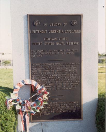 Keywords: Father Capodanno Memorial.jpg en Although I cannot remember the exact date I personally took this photo myself I believe sometime in the 1990s I still live very close to the location so I can take a new photo at any time The monument is located at the corner of Sand Lane and Father Capodanno Boulevard in Staten Island New York Seaside Boulevard had been renamed in Father Vincent's honor I believe in 1976 I will look through my files to verify the specific dates I hereby release this photo into the public domain own Elsquared unknown United States Navy chaplains Venerable people West New Brighton Staten Island Naval officers of the United States People of New York City Recipients of the Purple Heart United States 1967 deaths Italian Americans 1929 births Servants of God Casualties of the Vietnam War Plaques in New York City Vincent Capodanno Medal of Honor memorials |