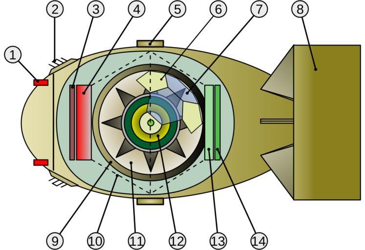 Keywords: Fatman inner1.svg Budowa bomby Fatman 1 AN 219 destruct fuse 2 Archie radar antenna 3 Plate with batteries to detonate charge surrounding nuclear components 4 X-Unit a firing set placed near the charge 5 Hinge fixing the two ellipsoidal parts of the bomb 6 High explosive pentagonal lens 12 units around the core made of high and low velocity explosive 7 High explosive hexagonal lens 20 units around the core made of high and low velocity explosive 8 California Parachute tail aluminium 9 Dural casing ~140 cm inner diameter 10 Cones that contained the whole sphere 11 Explosive lenses low and high velocity 12 Nuclear material see other figure for details about the different layers 13 Plate with instruments radars baroswitches and timers 14 Barotube collector Fatman_inner1 png 2010-08-24 12 54 UTC Fatman_inner1 png Dake derivative work Malyszkz <span class signature-talk >talk</span> zwektoryzowano Krzysztof ZajÄ…czkowski Fatman_inner1 png Cross sections of nuclear weapons Fat Man Diagrams labelled with numbers only