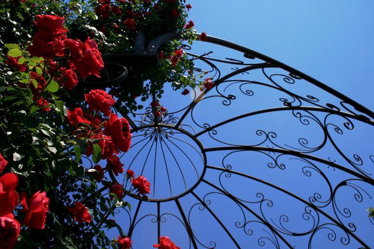 Keywords: feature construction garden metal ornate cage black rose red sky blue