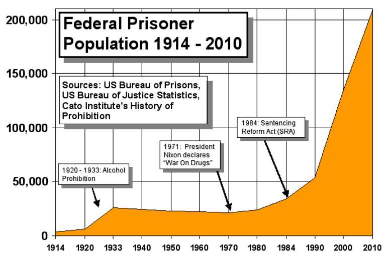 Keywords: Federal timeline US prisoners.gif U S Federal Bureau of Prisons - http //www bop gov bop gov - http //www bop gov/locations/weekly_report jsp Weekly Population Report U S Bureau of Justice Statistics BJS See http //bjs ojp usdoj gov/index cfm ty tp tid 1 Corrections The Punishing Decade Prison and Jail Estimates at the Millennium May 2000 Justice Policy Institute http //www nationalinstituteofcorrections gov/Library/015837 http //www justicepolicy org/images/upload/00-05_REP_PunishingDecade_AC pdf PDF file Includes several timelines Uses BJS and other data See Graph 1 for Number of Prison and Jail Inmates 1910-2000 It does not separate federal state and jail inmates Sources listed in the endnotes do See Historical Corrections Statistics in the United States 1850-1984 NCJ 102529 Published in 1986 http //www ncjrs gov/App/publications/Abstract aspx id 102529 http //www ncjrs gov/pdffiles1/pr/102529 pdf PDF file Prison Inmates at Midyear 2009 NCJ 230113 http //bjs ojp usdoj gov/index cfm ty pbdetail iid 2200 By Heather C West Ph D BJS Statistician June 2010 U S Bureau of Justice Statistics See Table 1 in the http //bjs ojp usdoj gov/content/pub/pdf/pim09st pdf PDF file Prisoners in 2008 NCJ 228417 http //bjs ojp usdoj gov/index cfm ty pbdetail iid 1763 By William J Sabol Ph D and Heather C West Ph D BJS Statisticians Matthew Cooper BJS Intern December 2009 U S Bureau of Justice Statistics See Appendix Table 1 in the http //bjs ojp usdoj gov/content/pub/pdf/p08 pdf PDF file http //www albany edu/sourcebook Sourcebook of Criminal Justice Statistics uses BJS data Number and rate per 100 000 U S residents of persons in State and Federal prisons local jails United States 1985 1990-2008 http //www albany edu/sourcebook/pdf/t6132008 pdf PDF file http //www albany edu/sourcebook/csv/t6132008 csv CSV file Includes both sentenced and unsentenced inmates There are separate totals for federal and state prisoners Federal prison population and number and percent sentenced for drug offenses United States 1970-2004 http //www albany edu/sourcebook/ind/DRUGS Prisoners Federal 2 html Total sentenced and unsentenced population Number and rate per 100 000 resident population in each group of sentenced prisoners under jurisdiction of State and Federal correctional authorities on December 31 By sex United States 1925-2008 Does not include jail inmates Does not separate federal prisoners from state prisoners http //www albany edu/sourcebook/pdf/t6282008 pdf PDF file http //www albany edu/sourcebook/csv/t6282008 csv CSV file Cato Institute - http //www cato org cato org http //november org/graphs/Federal1914 gif See graph for timeline dates November Coalition <br> Sentence with November org contact info removed from the bottom of the chart by User Timeshifter Please see Commons Watermarks See license information section below http //www november org/graphs is the November Coalition page with War on Drugs statistics charts and graphs That page says These graphs are in the public domain http //www november org/graphs The November Coalition Correctional population statistics for the United States Area charts Drug law enforcement |