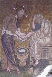 Keywords: Feet washing (Nea Moni).jpg Christ washing the feet of Saint Peter Detail of the inner narthex mosaic Washing of the Apostles' Feet http //campus belmont edu/honors/macedonian/greece2 html century 11 nonimus Mosaics in Nea Moni of Chios Mosaics of Jesus Christ washing the feet of the apostles PD-Art |