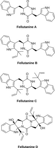 Keywords: Fellutanine A-D.svg en Structures of the 2 5-diketopiperazines Fellutanine A B C and D 2016-02-29 own Alandb other versions cc-zero Diketopiperazines Indole alkaloids