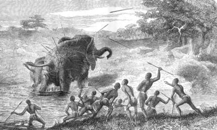 | Keywords: Female Elephant Pursued with Javelins.jpg en Female Elephant Pursued with Javelins Protecting Her Young She often stood after she had crossed a rivulet and faced the men though she received fresh spears It was by this process of spearing and loss of blood that she was killed for at last making a short charge she staggered round and sank down dead in a kneeling posture I did not see the whole hunt having been tempted away by both sun and moon appearing unclouded I turned away from the spectacle of the destruction of noble animals which might be made so useful in Africa with a feeling of sickness and it was not relieved by the recollection that the ivory was mine though that was the case I regretted to see them killed and more especially the young one the meat not being at all necessary at that time; but it is right to add that I did not feel sick when my own blood was up the day before We ought perhaps to judge these deeds more leniently in which we ourselves have no temptation to engage Had I not been previously guilty of doing the very same thing I might have prided myself on superior humanity when I experienced the nausea in viewing my men kill these two pp 562-563 1857 http //libweb5 princeton edu/visual_materials/maps/websites/africa/livingstone/livingstone-images html David Livingstone Missionary Travels and Researches in South Africa Including a Sketch of Sixteen Years ™ Residence in the Interior of Africa and a Journey from the Cape of Good Hope to Loanda on the West Coast Thence Across the Continent Down the River Zambesi to the Eastern Ocean London John Murray 1857 David Livingstone other versions PD-Art Uploaded with UploadWizard Elephants being killed Javelins |