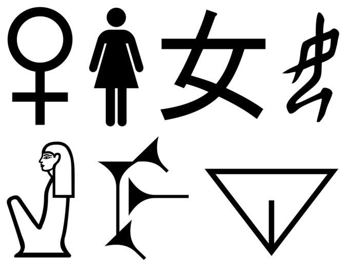 | Keywords: Female symbols.svg Signs for female and/or woman in various symbol systems <br> Top row Venus sign toilet pictogram modern Chinese character 女 ancient form of Chinese character apparent abstract drawing of kneeling woman <br> Bottom row Ancient Egyptian hieroglyph B1 in Gardiner's sign list late 1st millennium B C form of Cuneiform sign early Sumerian Cuneiform abstract drawing of pubic triangle <br><hiero>B1 </hiero> The three symbols at the left of the top row are the ones in active current use with many slight visual variations of each Outlines taken from the following images and from fonts the Egyptian hieroglyphic font by Serge J P Thomas HeteroSym svg Toilets unisex svg U5973-radical-38 early-form svg MUNUS-SAL-sinnishtu Cuneiform svg Vulva symbols svg HeteroSym svg Toilets unisex svg U5973-radical-38 early-form svg MUNUS-SAL-sinnishtu Cuneiform svg Vulva symbols svg 2013-03-25 AnonMoos based on fonts and PD images v Female symbols Woman hieroglyph Symbol charts |